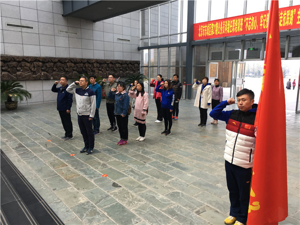 在庄严的烈士像前,“不忘初心,牢记使命,重走抗联路”主题教育培训班开班仪式正式开始,东北抗联史实陈列馆工作人员向建筑工程系党总支授旗,党员同志们齐唱国歌,向烈士进献花圈,为烈士默哀,重温入党誓词。
