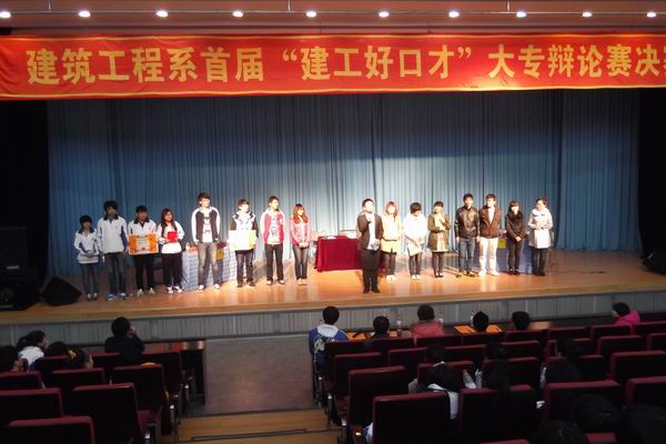 3月27日,由我系团总支学生会学习部组织的首届“建工好口才”大专辩论赛总决赛在报告厅隆重开赛。 大赛评委团由建筑工程系党总支副书记郭鹏、建筑工程系办公室主任周扬、建筑工程系教师老士翠、建筑工程系团总支学生会副主席邢家阳、建筑工程系团总支学生会学习部部长夏冰担任。我系11级、12级各班的代表组成学生大众评审团。最终,12钢结构班取得本次大赛的第一名,11监理班获得第二名,12检测1班获得第三名。学生大众评审团通过投票评选12钢结构班郭春秋同学为最佳辩手,11建工3班为最佳团队。