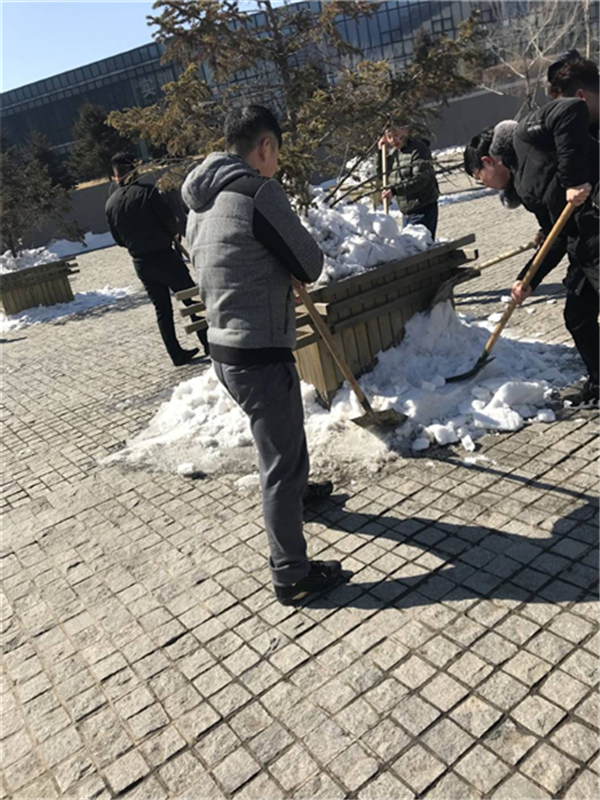 中午下课后80名志愿者连饭都没有顾得上吃,直接到后勤处领取除雪除冰任务和扫除工具,他们分赴学院3个点位进行清理积雪和冰冻等。虽然气温接近零度,但是进入九九的天气依然寒风刺骨,同学们不顾天气寒冷,撸起袖子,抡起工具开始了义务劳动。人多力量大,不到一个小时的时间时钟广场就发生了巨大变化,路上的积雪没有了,阶梯上的冰也除掉了,看着安全行走在校园中的师生们,志愿者的嘴角露出了一丝微笑。