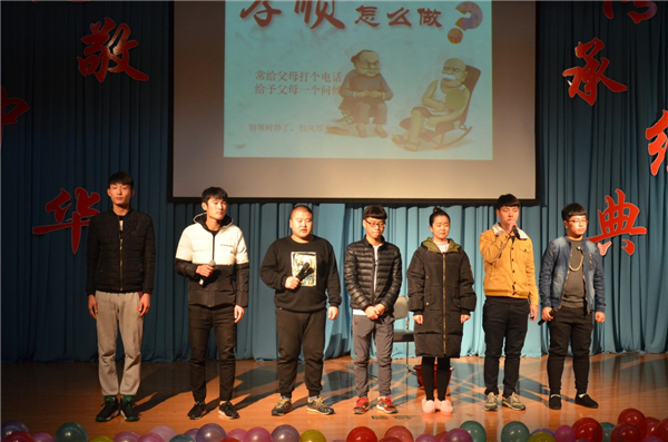 为弘扬中华优秀传统文化,让我系学生更好地传承中华传统美德,建筑工程系文艺部、学习部于2016年12月12日在报告厅举办了建筑工程系“礼敬中华,传承经典”主题系列活动。建筑工程系党总支副书记周扬,文艺部指导老师王琛,辅导员老师宋思宇出席了本次活动,建筑工程系团总支学生会主席团及各部部长担任本次活动评委,建工系400余名同学参加了本次活动。 此次活动分为传统文化知识竞赛和情景剧表演两个环节。经过紧张激烈的知识竞赛和精彩纷呈的情景剧表演,最终16钢结构班凭借24孝故事《卧冰求鲤》获得一等奖,16监理1班获得二等奖,16检测2班获得三等奖。