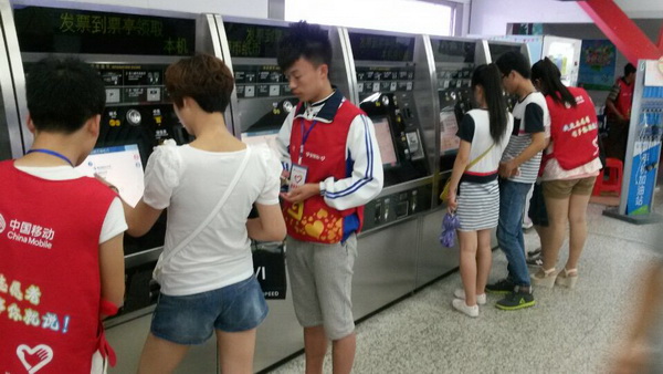志愿者们正在认真引导乘客购票