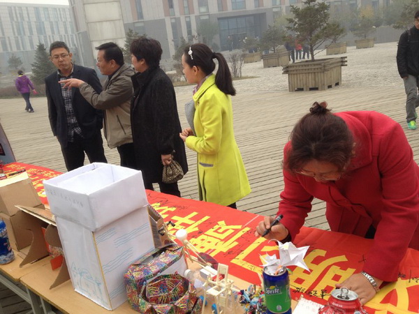 在宣传场地我系学生展示了利用生活中的废品自制的具有观赏价值和使用价值的手工艺品。此次活动也得到院、系领导、老师和学生的积极支持与响应,大家纷纷在宣传条幅上签名。通过本次活动,大家对新时期勤俭节约废物利用的观念有了更新的认识,达到了很好的宣传效果。