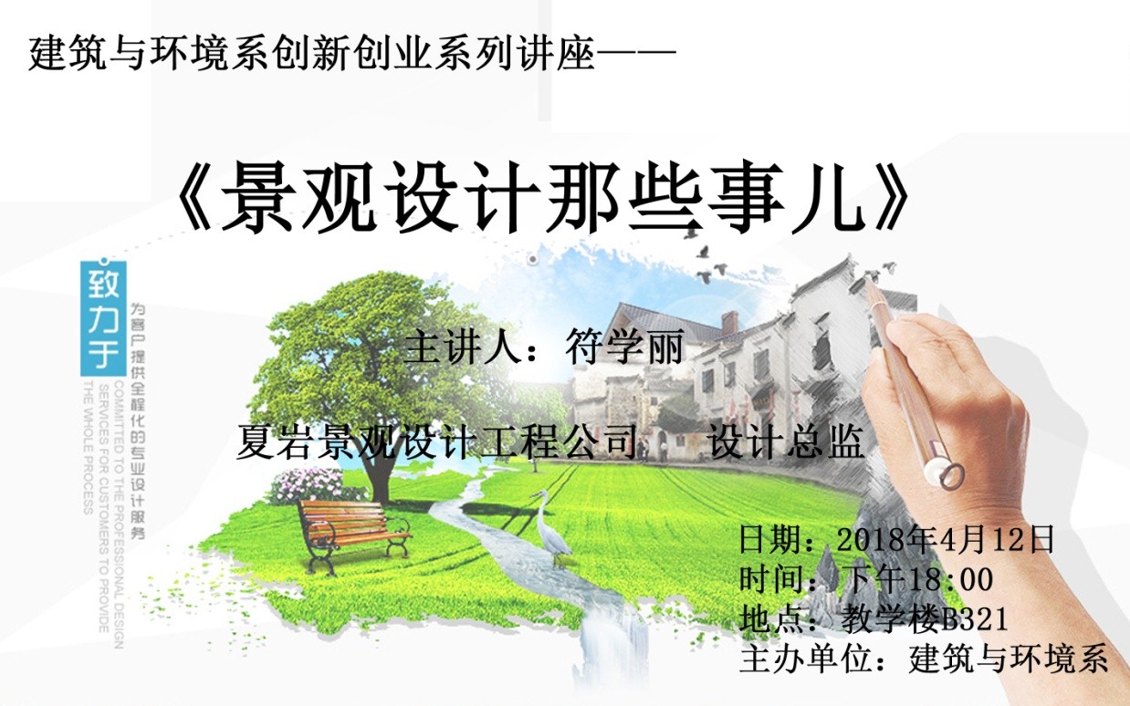 2018年4月12日,夏岩景观设计工程公司设计总监符学丽在教学楼B321做了关于《景观设计那些事儿》的专业讲座。