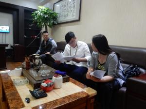图为刘主任和杨书记与李经理就课程设置和学生培养问题展开探讨