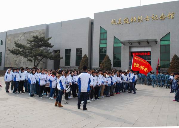 苍松翠柏掩映的烈士陵园里,教师和同学们身带白花,庄严肃立,满怀哀思,在“抗美援朝烈士英灵永垂不朽”纪念碑前为英雄们敬献花圈,默哀致敬。张博同学代表学生发言,表达了对英雄们奋不顾身的爱国主义精神,舍生忘死的革命英雄主义精神的无限崇敬之情。随后,同学们瞻仰烈士墓,参观抗美援朝烈士纪念馆。