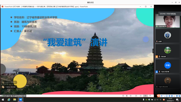 6月11日下午,建筑与环境系在在腾讯会议室举办了“我爱建筑”主题演讲比赛。本次比赛的举办让同学们增强学习兴趣,激发学习热情,交换学习经验,在活动中完善自我。