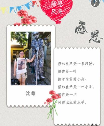 2017年9月10日,我们迎来了第三十三个教师节,各班在教师节到来之前,我系进行了以“秋水蒹葭、师恩难忘”为主题的街坊拍摄,同学们在教师节,用自己的方式为老师庆祝节日,同学们在号召之下,做到了用朴素、多样的形式表达对老师的感谢之情,让我们同学对老师送出祝福。