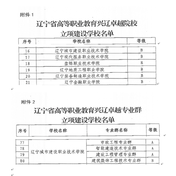 近日,辽宁省教育厅、辽宁省财政厅发布了《关于公布高等职业教育兴辽卓越院校和兴辽卓越专业群建设项目名单的通知》(辽教发[2021]79号),公布了“辽宁省高等职业教育兴辽卓越院校和兴辽卓越专业群”立项建设学校名单,学院成功入选兴辽卓越院校立项建设B等单位。同时市政工程技术、智能建造技术、建设工程管理、建筑装饰工程技术等4个专业群入选兴辽卓越立项建设专业群。