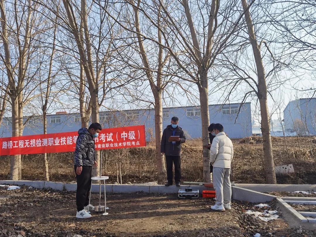 “1+X”路桥工程无损检测职业技能等级证书(中级)考试严格按照教育部相关规定和“1+X”路桥工程无损检测职业技能等级考核相关标准有序进行,现场随机抽取考试项目、工位号及测区。考试项目为混凝土项目:混凝土厚度(冲击回波法)、混凝土裂缝(pc相位反转法)、混凝土内部缺陷(冲击回波法)三选一;其它项目:锚杆长度(冲击弹性波法)、立柱长度及埋深、钢筋分布及保护层厚度、路基回弹模量(落球法)四选一。