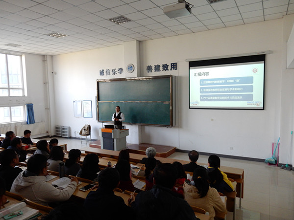 “云课堂教学法”主题讲座。讲座由教务处副处长姜锐主持,全体专兼职教师参加。王斌院长、教务处谭禾丰处长出席讲座。