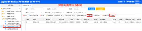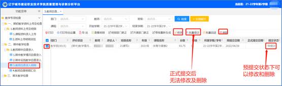点击左侧功能菜单【教学专项检查】-【期中教学检查】-【教师期中自查录入】-【3.教师自查明细报表】-进入自查明细报表页面;“预提交”状态下的数据可以修改及删除,正式提交后不能修改及删除。
