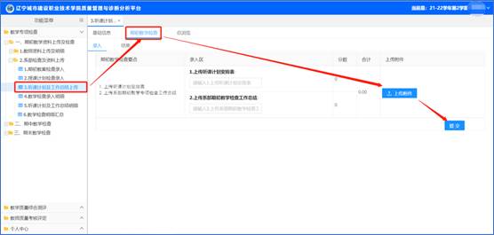 1)点击左侧功能菜单【教学专项检查】-【期初教学资料上传及检查】-【系部检查及资料上传】-【听课计划及工作总结上传】进入录入页面。