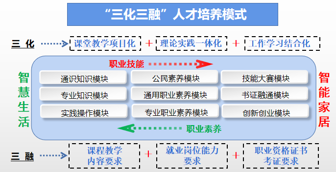 本专业紧密结合智能家居产业链发展以及建筑电气工程技术专业岗位(群)职业能力要求,构建本专业“三化三融”的人才培养模式:其中“三化”是指课堂教学项目化、理论实践一体化、工作学习结合化;“三融”是专业课程教学内容要求与就业岗位能力要求、职业资格证书考证要求相融合,即岗、证、课相融合。