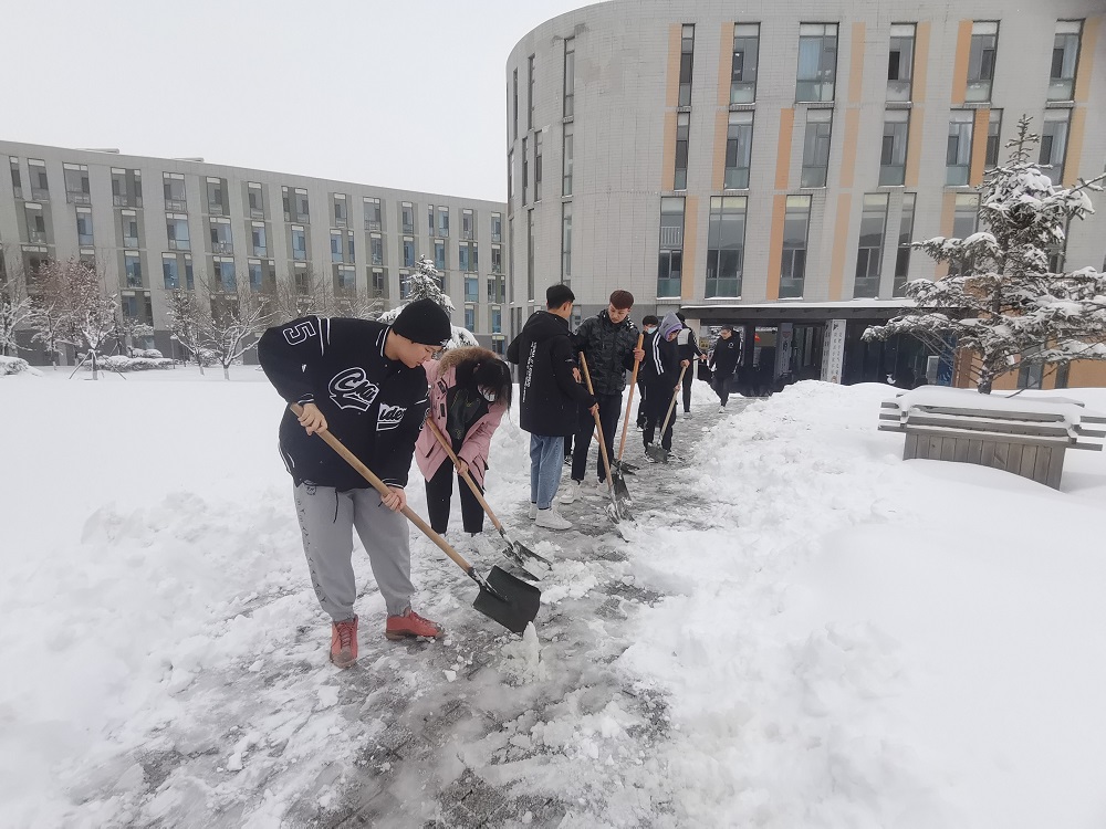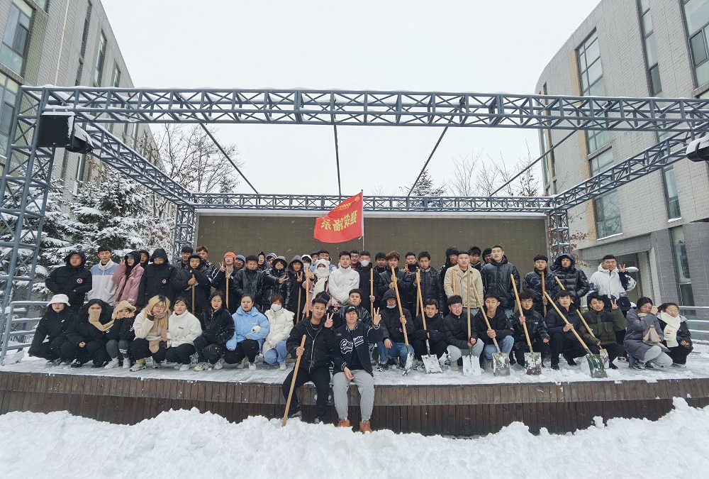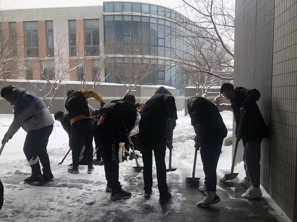 11月8日,沈阳迎来了入冬以来的第一场雪,突降的暴雪将校园妆点成了银装素裹的世界,同时也为同学们的出行带来许多不便。为保障学校师生出行安全,消除安全隐患,建筑设备系青年志愿者们于11月9日中午在学生公寓、文体馆门前开展义务扫雪活动。
