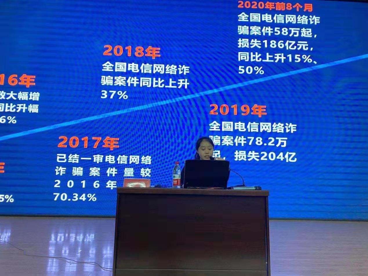 符星警官通过“什么是电信诈骗”、“电信诈骗的常见形式”、“如何识别防范电信诈骗”等多个方面内容进行详细的讲解,通过短视频、网络诈骗案例、现场提问等形式,向全体师生介绍了常见的校园诈骗案件,剖析了骗子常见的伎俩和手段。讲座最后,符星警官强调切勿轻易相信他人,不轻信来历不明的电话、短信,不轻易透露自己的身份和银行卡的信息,加强安全知识学习,不断提高自我预防、自我保护、自我应对能力。