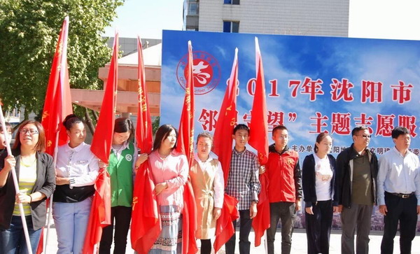 | 9月23日上午,2017年沈阳市暨沈河区“邻里守望”主题志愿服务活动启动仪式在沈河区敬宾街东广场举行,我系学生参加了启动仪式并被授予“邻里守望志愿沈北”大学生志愿服务队旗帜。