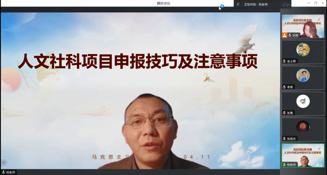 为拓展教师的学术视野,提升高水平项目申报质量,4月11日马克思主义学院特邀天津理工大学姚修杰教授,围绕“如何成功申报高水平科研项目”作专题讲座,全体思政教师参加并认真听取了讲座。