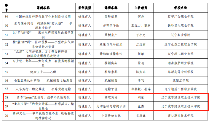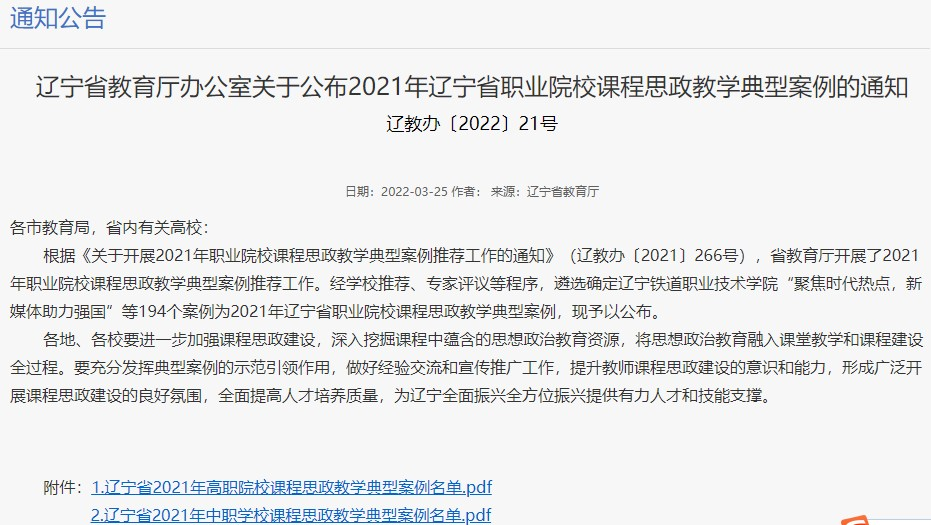3月25日,辽宁省教育厅办公室公布了《2021年辽宁省职业院校课程思政教学典型案例的通知》,学院报送的3名老师全部入选,包括张杰老师的《“重车压梁”下的弯矩计算——科学减灾、精业敬业》、刘莹老师的《青春“dream”正当时,筑梦不负新时代》、丛国凤老师的《树牢信息安全意识 增强网络法治观念》。