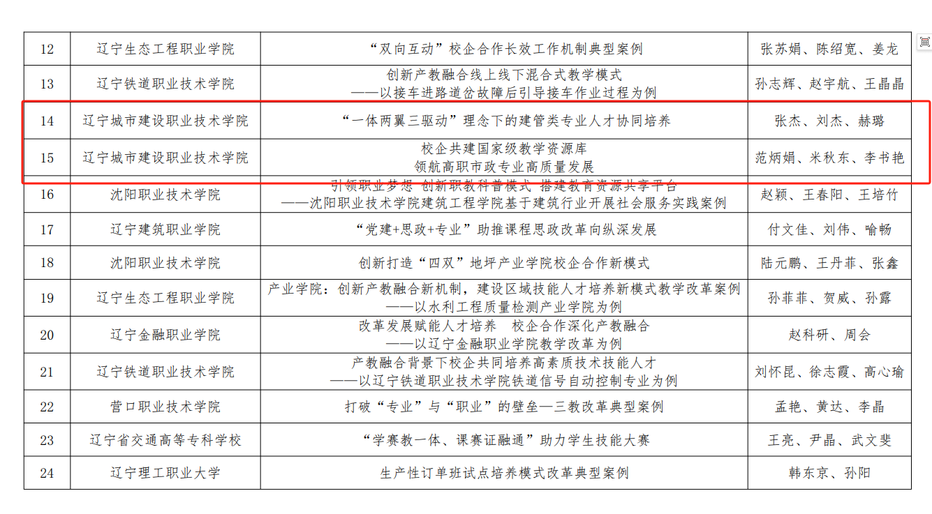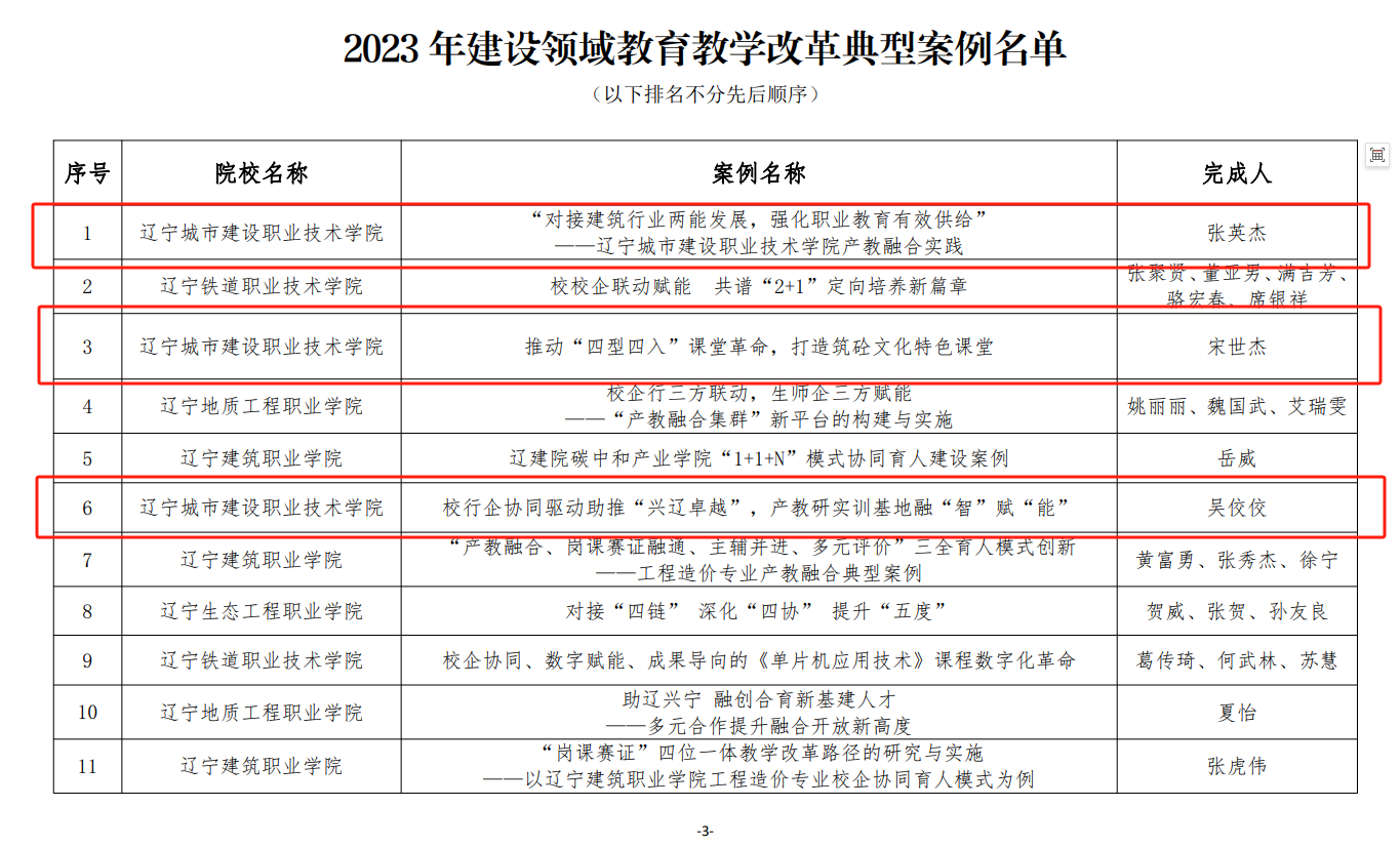 3月9日,辽宁建设职业教育集团联合辽宁省土木建筑学会、辽宁铁道交通职业教育集团完成2023年建设领域教育教学改革典型案例评选,并公布结果,共24项案例入选。学校推荐的《“对接建筑行业两能发展,强化职业教育有效供给”——KY开元集团官网入口产教融合实践》《推动“四型四入”课堂革命,打造筑砼文化特色课堂》《校行企协同驱动助推“兴辽卓越”,产教研实训基地融“智”赋“能”》《“一体两翼三驱动”理念下的建管类专业人才协同培养》《校企共建国家级教学资源库 领航高职市政专业高质量发展》等5项案例获评为典型案例,进一步强化了学院人才培养工作的区域示范引领作用。