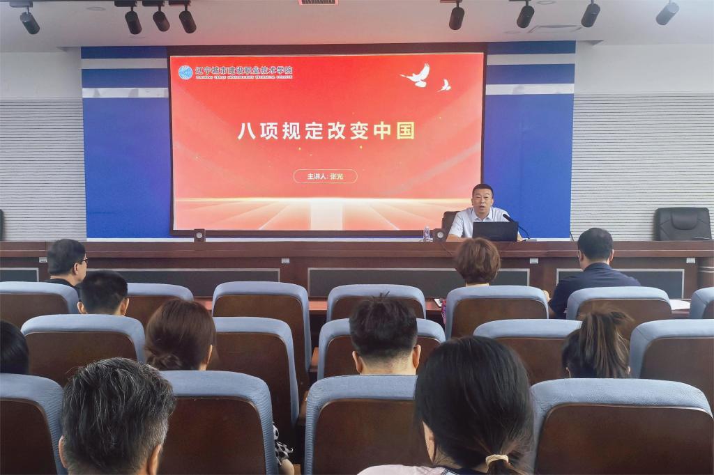 在专题讲授中,学校领导强调,党的十八大以来,以习近平同志为核心的党中央将作风建设摆在新时代党的建设总体布局重要位置,把制定实施中央八项规定作为党在新时代的徙木立信之举。八项规定历史性地改变中国,已经成为新时代管党治党的“金色名片”,必须倍加珍惜、不断擦亮。于海臣指出,作风建设关系党的形象,关系人心向背,关系党的生死存亡,党的百年历史也是一部党为永葆自身的先进性和纯洁性,坚决纠治不正之风和整治腐败问题的斗争史;作风问题本质上是党性问题,八项规定是长期有效的铁规矩、硬杠杠,全校上下要坚持以习近平新时代中国特色社会主义思想为指导,深入学习领会习近平总书记关于加强党的作风建设的重要论述,锲而不舍贯彻中央八项规定精神,为学校改革发展提供坚强的思想和作风保障。徐长伟结合学校实际,强调作风建设要与教育教学、人才培养目标紧密结合,赋能减负提质,切实将精力投入到服务师生、提升教育教学质量中,不断增强贯彻落实的政治自觉、思想自觉和行动自觉。张光从政治、经济、社会、文化等多维度阐述中央八项规定精神的深远影响,要求党员干部担当作为、关爱师生,将学习成果转化为提升思想的标杆、谋划工作的思路、推进事业前进的动力。王川聚焦纪律建设,围绕《中国共产党纪律处分条例》,重点讲解违反中央八项规定精神问题的纪法适用、行为认定及处理原则,要求广大党员强化纪律意识,严守党规党纪,厉行节约、反对浪费、严禁违规吃喝。