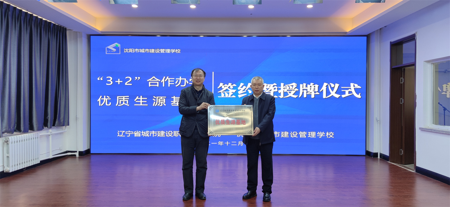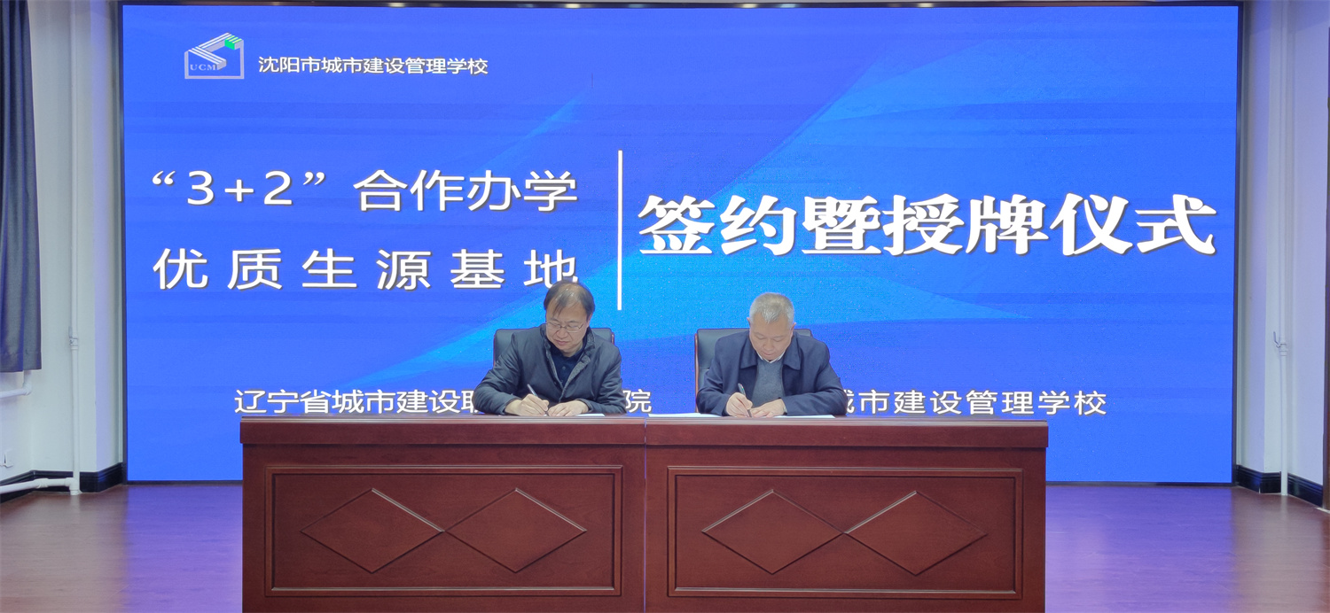为贯彻落实《国家职业教育改革实施方案》,推进学院高质量发展,2021年12月15日,学院与沈阳市城市建设管理学校中高职3+2合作办学签约和优质生源基地授牌仪式在沈阳市城市建设管理学校举行,王斌院长等一行5人,沈阳市城市建设管理学校领导班子以及相关科室负责人参加了本次签约仪式,沈阳市城市建设管理学校刘林书记主持签约仪式。