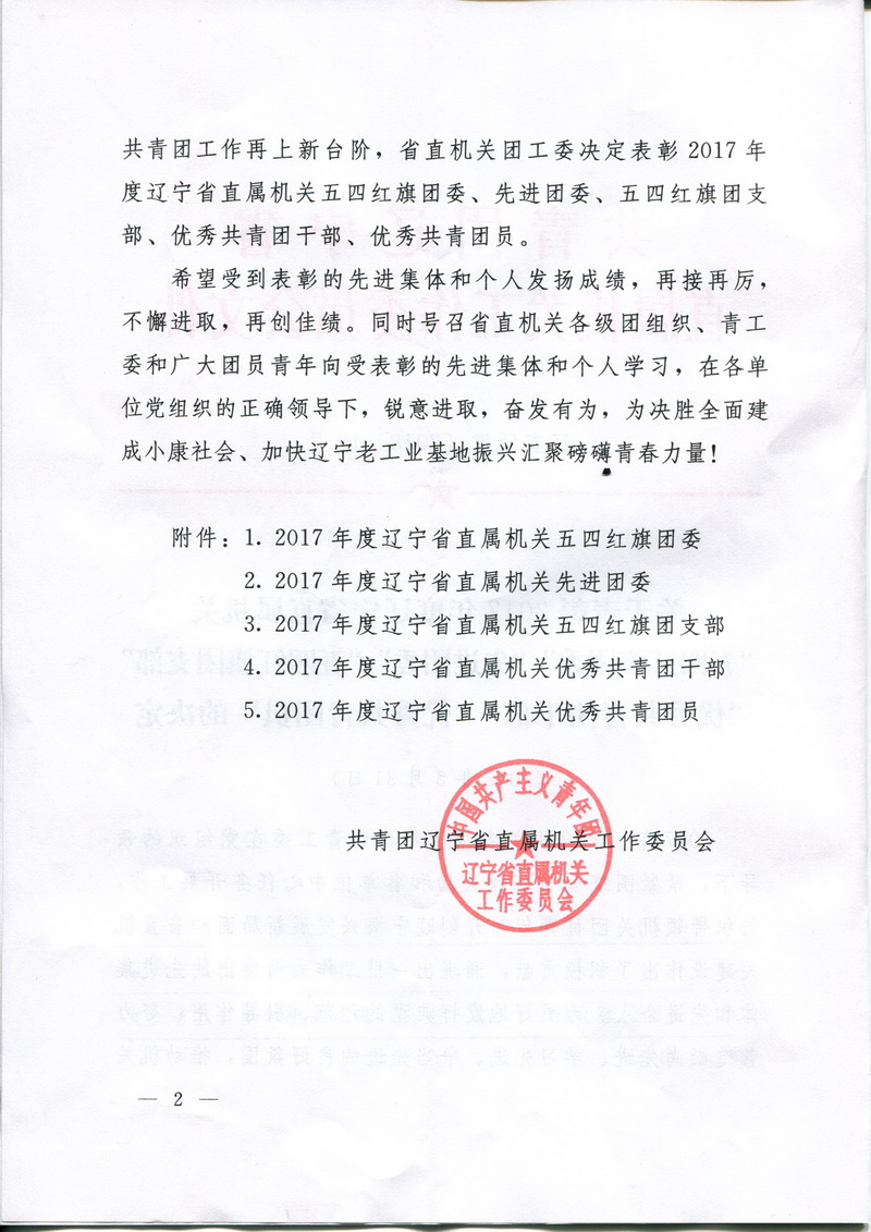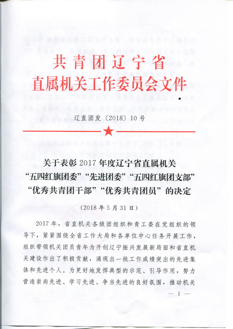 | 近日,共青团辽宁省直属机关工作委员会印发了《关于表彰2017年度辽宁省直属机关“五四红旗团委”“先进团委”“五四红旗团支部”“优秀共青团干部”“优秀共青团员”的决定》(辽直团发〔2018〕10号),我院团委荣获“五四红旗团委”荣誉称号,同时4个团支部荣获“五四红旗团支部”荣誉称号、6名个人被评为 “优秀共青团干部”,5名个人被评为“优秀共青团员”。 近年来,学院团委在院党委和上级团组织领导下,紧紧围绕学院中心工作,不断深化“凝聚青年、服务大局、当好桥梁、从严治团”四维工作格局,注重思想引导、坚持载体创新、深化品牌活动、强化自身建设,形成了具有鲜明时代特征、青年特点和学院特色的团学工作格局,在活力团支部建设、青年志愿者服务、大学生志愿者暑期三下乡社会实践、挑战杯课外学术科技作品竞赛、彩虹人生职业学校创新创业创效大赛、创青春辽宁省大学生创业大赛等省市多项评比和比赛中取得丰硕成果。 此次,院团委荣获2017年度辽宁省直属机关“五四红旗团委”荣誉称号是对我院共青团工作的肯定和鞭策。在日后的工作中,团委将继续以党的十九大精神和习近平新时代中国特色社会主义思想为指导,以改革创新为动力,积极引导青年,以永不懈怠的精神状态努力推进各项工作。