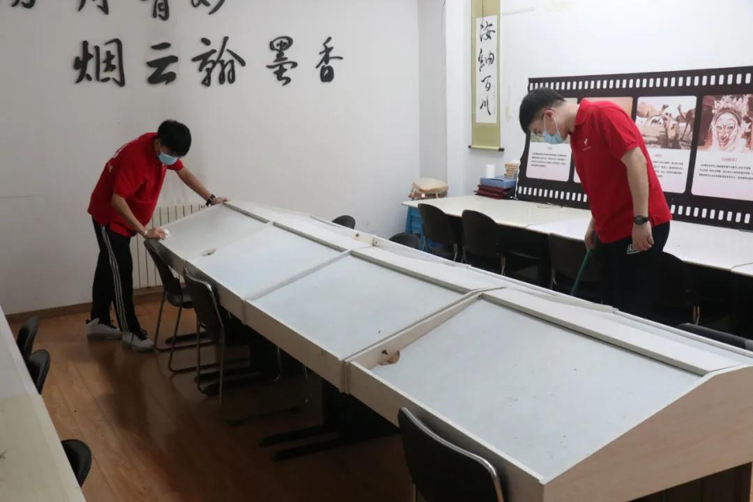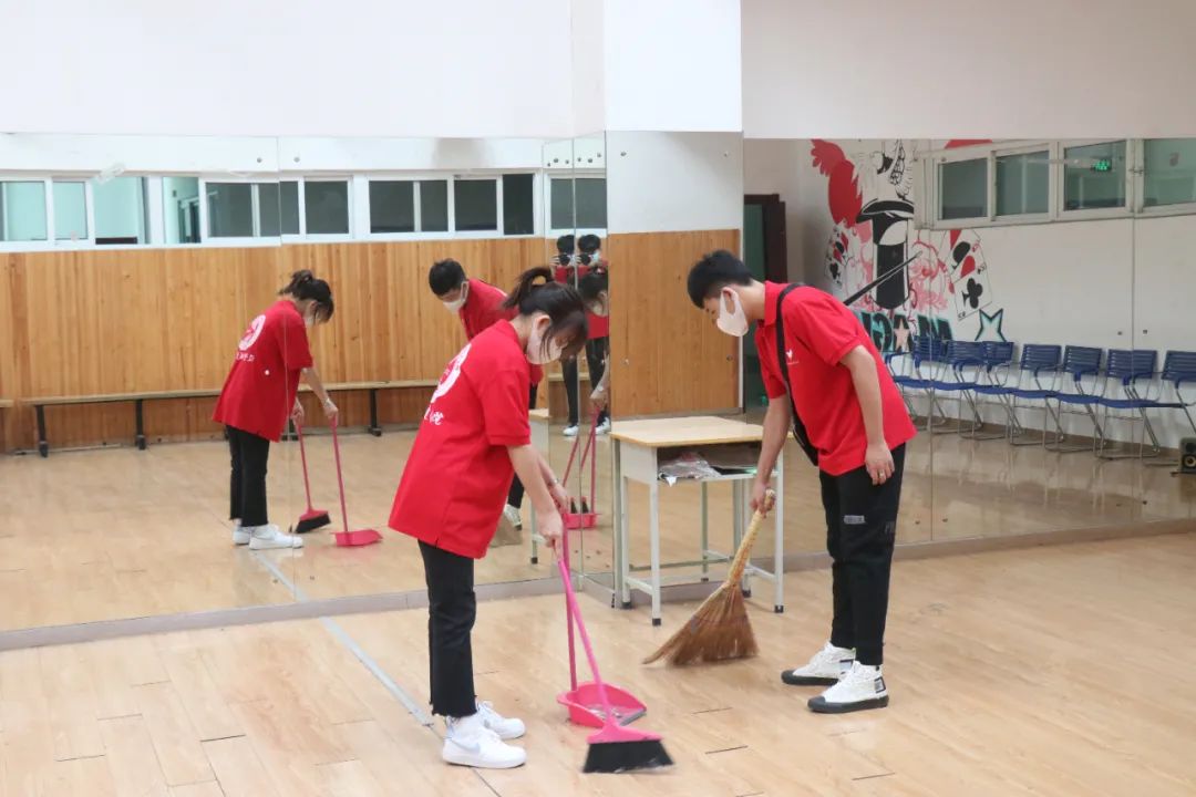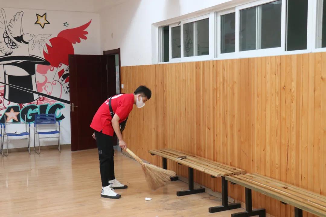 9月15日清晨,志愿者们在文体馆楼下集合签到后开始分配任务。志愿者们手拿清扫工具,认真的清扫每一间活动室。志愿者们秉着“奉献、友爱、互助、进步”的志愿者精神,高质量地完成任务,细致地将平时容易忽略掉的死角也打扫的干干净净。