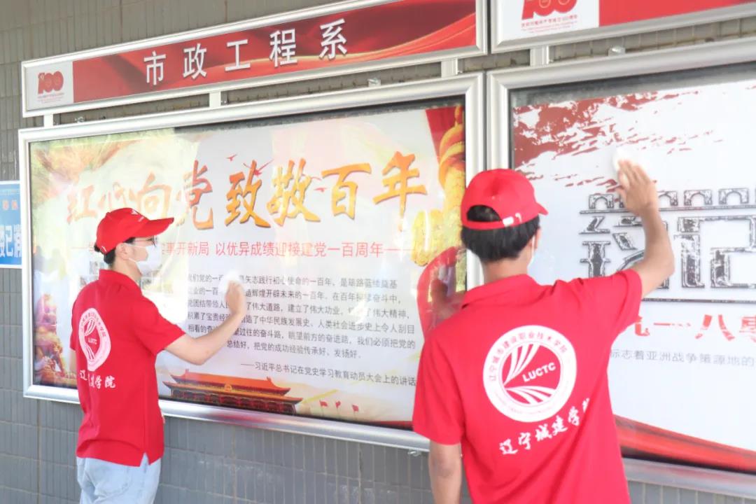 打扫完活动室后,志愿者们对各系宣传展板也进行了打扫。