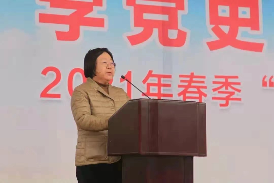 党委书记高玉英发表讲话。她指出,2021年是中国共产党成立一百周年和国家“十四五”规划开局之年,学院全体师生要深入学习贯彻习近平总书记在党史学习教育动员大会上发表的重要讲话精神,做到学党史、悟思想、办实事、开新局,通过同升一面旗、共唱一首歌,激发历史责任感、使命感和爱党爱国情怀,以昂扬姿态奋力开启2021年春季学期新征程。