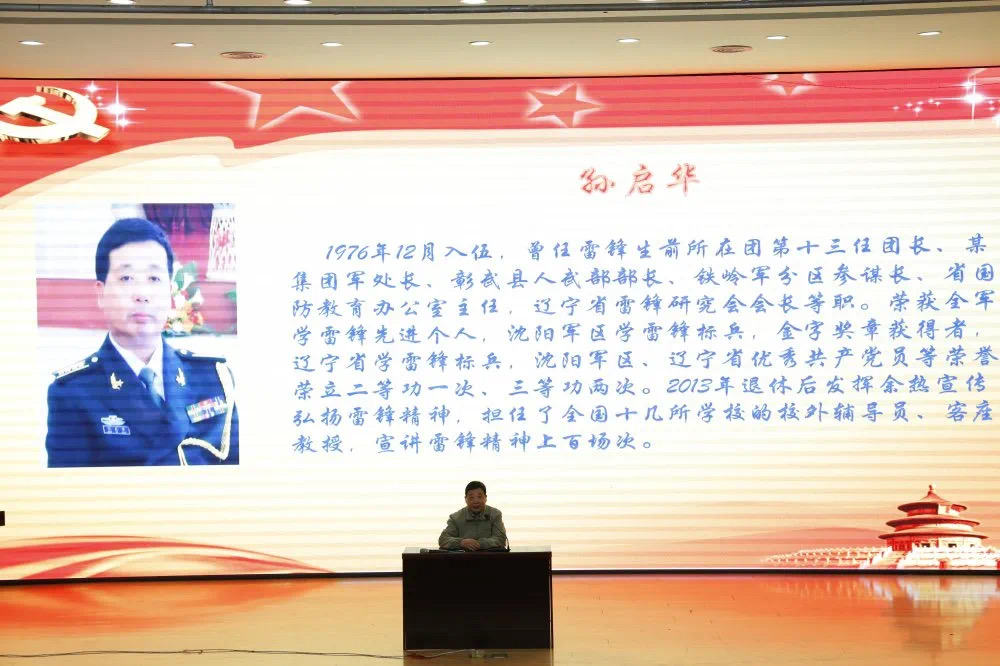 孙启华,原省国防教育办公室主任。1976年12月入伍,曾任雷锋生前所在团第十三任团长、铁岭军分区参谋长、辽宁省雷锋研究会会长等职。荣立二等功一次、三等功两次,荣获全军学雷锋先进个人,沈阳军区学雷锋标兵,辽宁省学雷锋标兵等荣誉,2013年退休后发挥余热宣传弘扬雷锋精神,担任了全国十几所学校的校外辅导员、客座教授,宣讲雷锋精神上百场次。