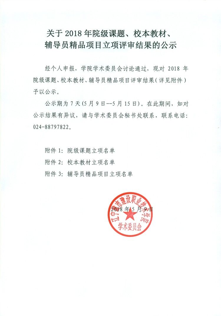 关于2018年院级课题、校本教材、辅导员精品项目立项评审结果的公示