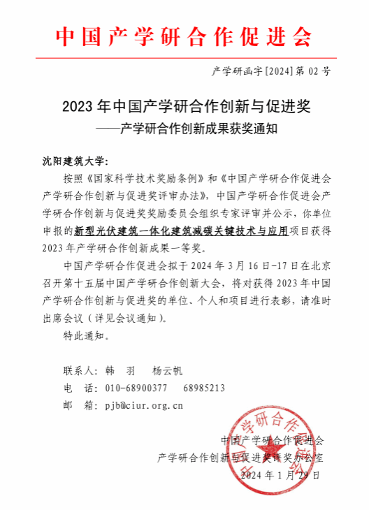 新年伊始,辽宁建设职业教育集团(校企联盟)单位---沈阳建筑大学绿色能源建筑与城市研究院牵头完成的“新型光伏建筑一体化建筑减碳关键技术与应用”成果荣获“2023年中国产学研合作创新成果奖一等奖”。