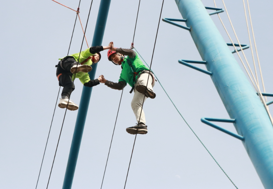 本次拓展训练开展了2项高空项目,首先做的是巨人梯,通过项目可增强参与人员的心理素质提升团队协作能力,接下来进行的是空中相依,该项目是可以帮助参与人员增强自信心,克服心理的障碍,磨练战胜困难的毅力,促进大家相互信任,融洽地与他人及群体合作,达到团体一致性,并形成团队成员间配合默契。
